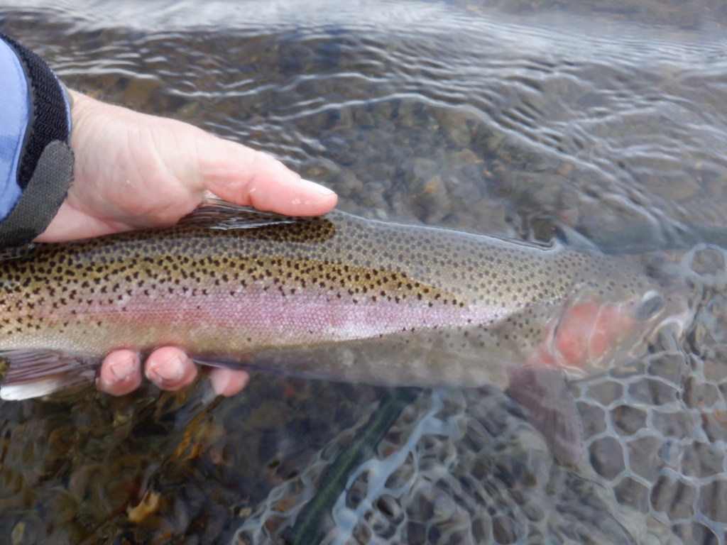 There is a junction upstream where several braids come together and form a series of deep slots, the next fishy spot on this stretch. I swung the Bakers Hole Bugger and Grouse + Pink combo through a slot that produced on another trip, but got no bumps. On the last swing to the end of the pool, I thought I was snagged when I lifted the rod, but it was a rainbow that stealth-ate the pink fly. Not a bruiser, but a pretty fish, and big enough to be a lake runner.