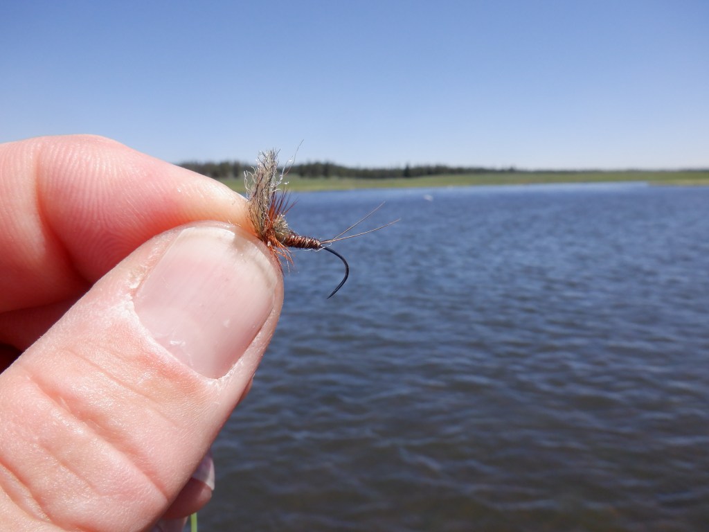 One of the days that I was on the water there this past June, a fierce wind came up and blew whitecaps all across the wide slow water, ruling out any dry fly fishing, and I had a couple of miles to walk back to where I had parked the bike. Rather than get out and walk a beeline across the grassy valley floor, I changed up my dry fly rig to a bobber and a heavy red Copper John, which is about the size of the drake nymphs I’d been looking at.