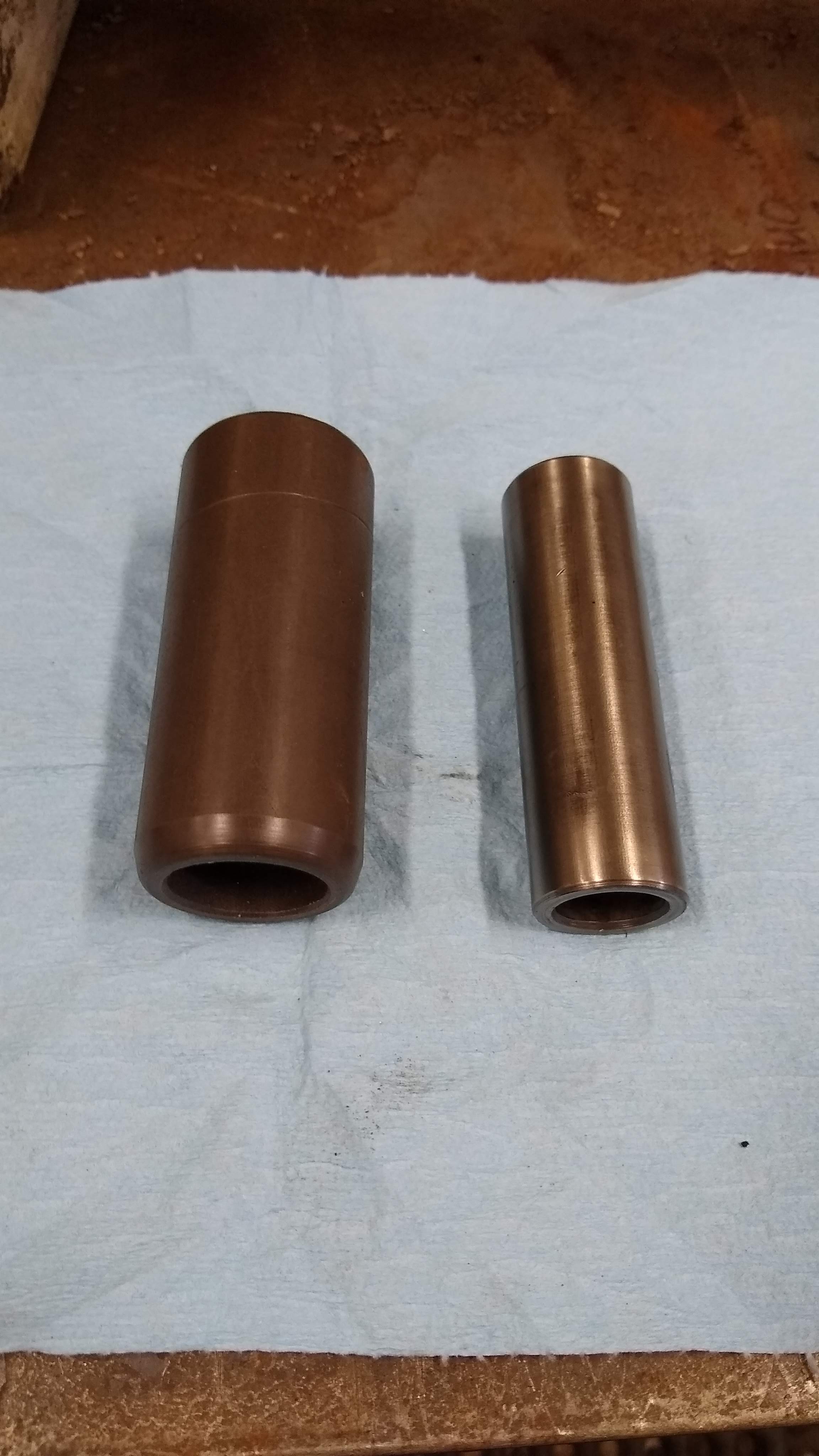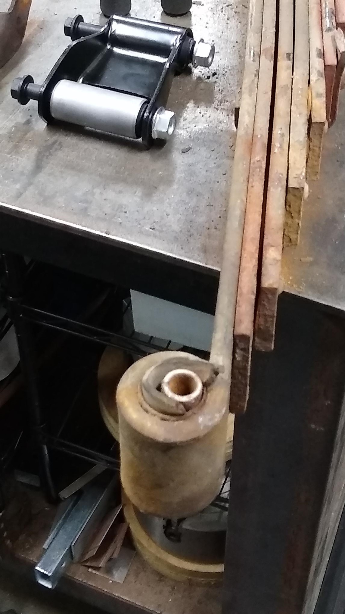 Changing the spring bushings was harder than I anticipated and I needed the big hydraulic shop press to get them out and in. The rear bushing has a steel outer housing that was rusted solid to the spring and had to be chiseled out with my air hammer. The front bushing has no outer sleeve, just rubber, but it also had to be pressed out. I had bought the wrong bushings for the front and rather than wait a few days to get them, I decided to make a couple from Delrin, using the existing inner sleeve. We had some 1.5″ diameter stock, which happened to be the OD needed, so I only had to bore a hole to suit the sleeve and part them off to length. It will be interesting to see how long they live, given that the stock rubber ones were almost entirely squeezed out.