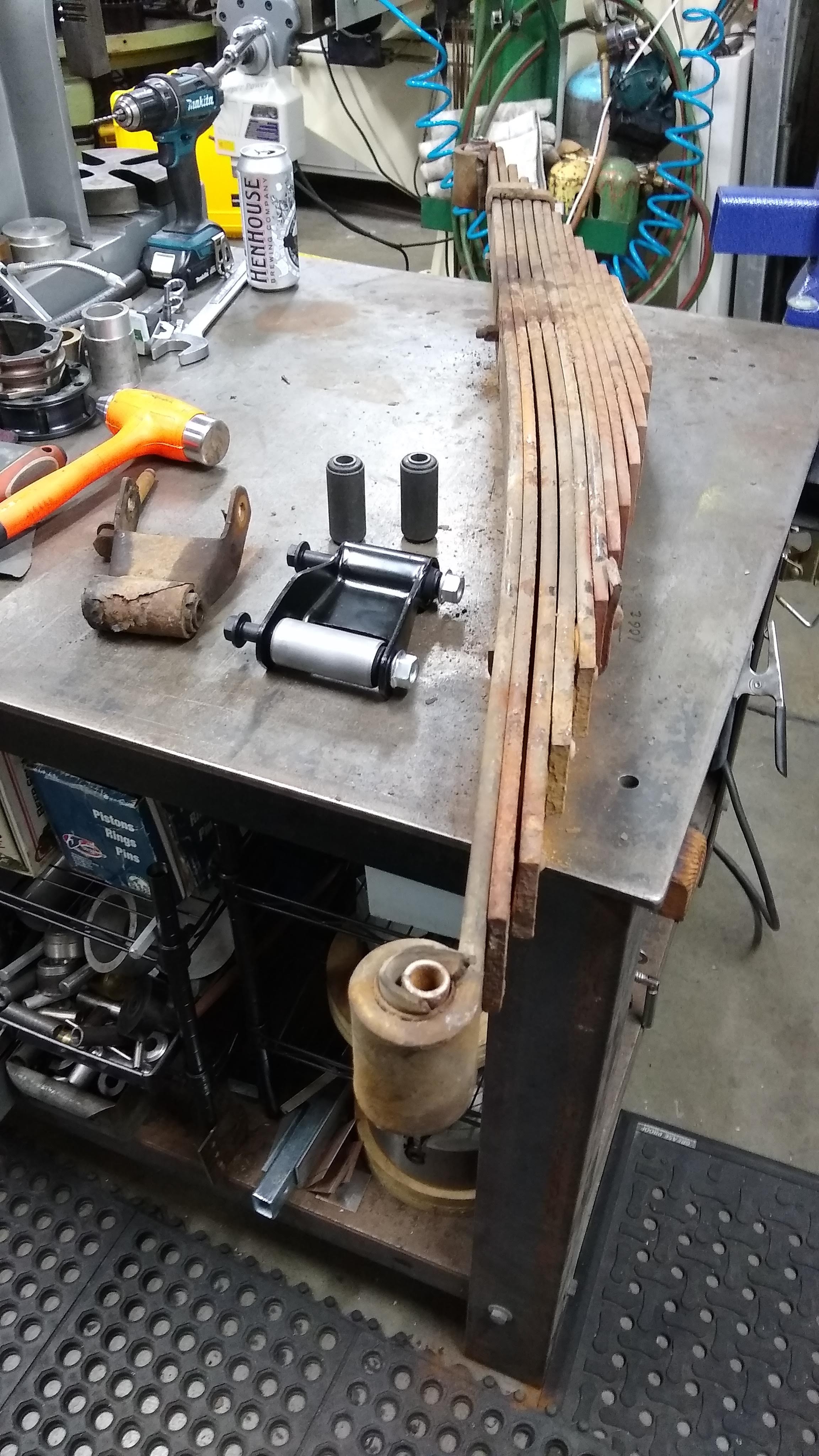 As you might imagine, these springs are really heavy, too heavy to easily maneuver in and out of the chassis single-handed. I wasted a lot of time with a long pry bar trying to shift them to a position where the pivot bolts were free, the key being to make sure the frame is raised high enough on the stands to allow the axle to droop far enough below the spring.