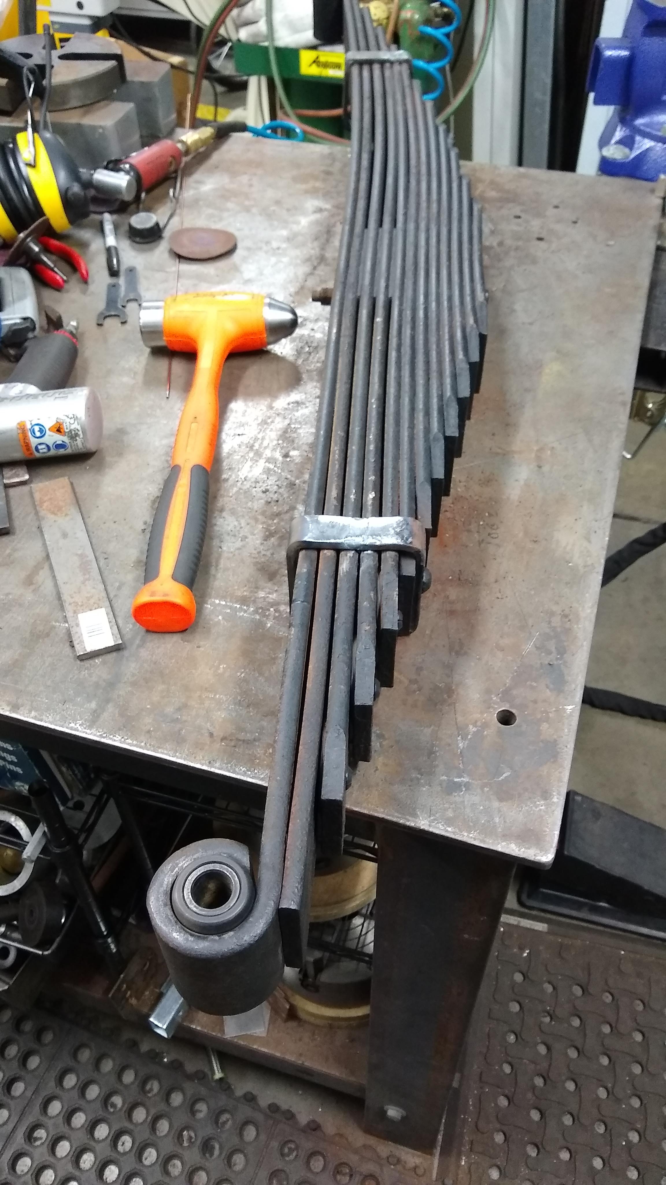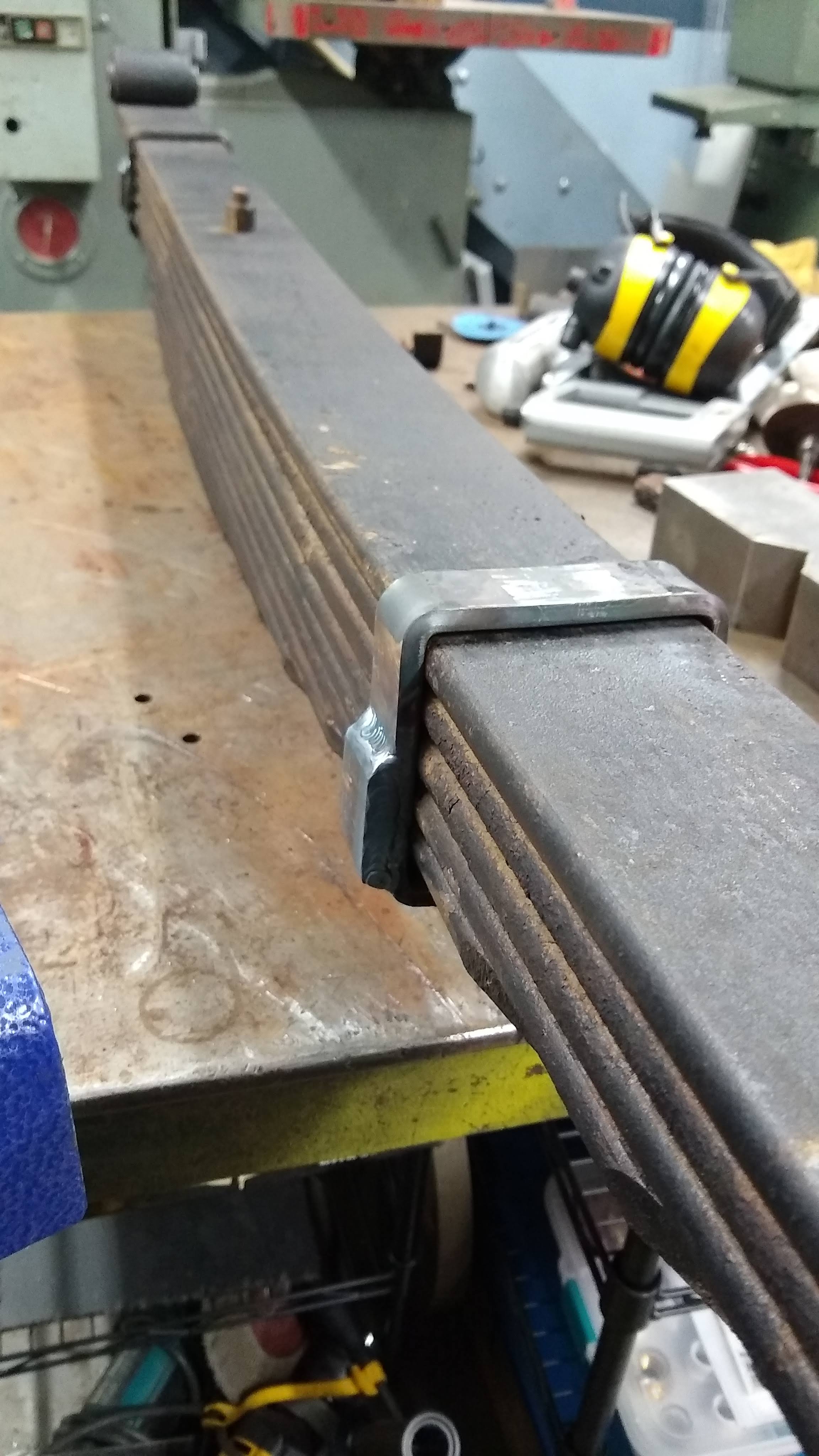 Once inside on the steel fab table, I was able to use my BFG hammer to pound the leaves back to parallel, and fabricate new clamps from 1/4″ steel strap. Since the original clamps had failed, I went overboard making sure that my replacements were heavy-duty. I butt-welded the new clamps to the remaining portion that is riveted to the spring leaf, then welded a strap across the butt weld.