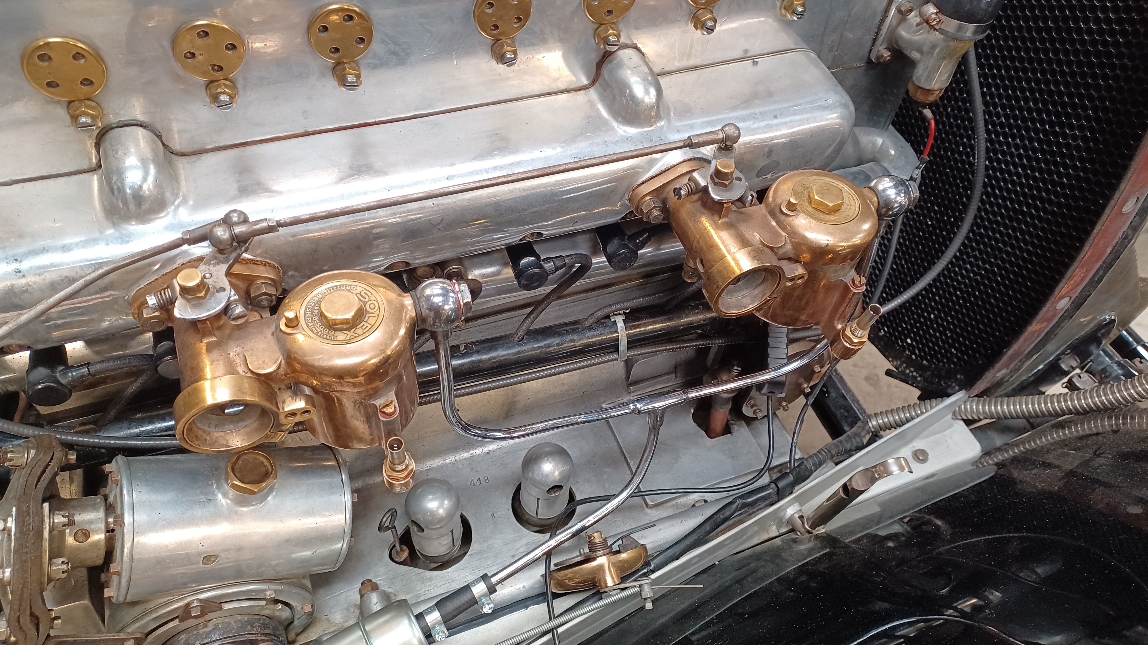 Next, I looked inside the carbs to see what we were dealing with… the nearly 100 year old Solexes were in OK shape, but had not been put together correctly. Plus, the floats had been repaired multiple times and were heavy with solder. One was still leaking and sank badly. Our ace fabricator carefully warmed the brass float until all the gasoline had evaporated out, then fixed the pinhole leak with a small dot of new solder. But both floats were still a couple of grams heavier than the design weight of 42, and the fuel level needed correcting by spacing the float valves lower in the bowl.