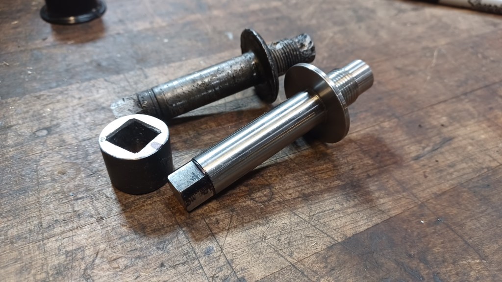 So I machined the basic shape of the new shaft from a billet of steel, making it oversize to fit the original bushing that I had reamed to remove the taper wear at each end. The tricky bit was to make the odd-size Bugatti thread for the impeller in a way that it fit securely. I had single-pointed a couple of test pieces to find the best thread major diameter, which was a fair bit larger than the calculated ideal. The female thread in the impeller was worn in a taper though, so further hand work on the new shaft was required to get the impeller seated solidly onto the shoulder of the shaft.