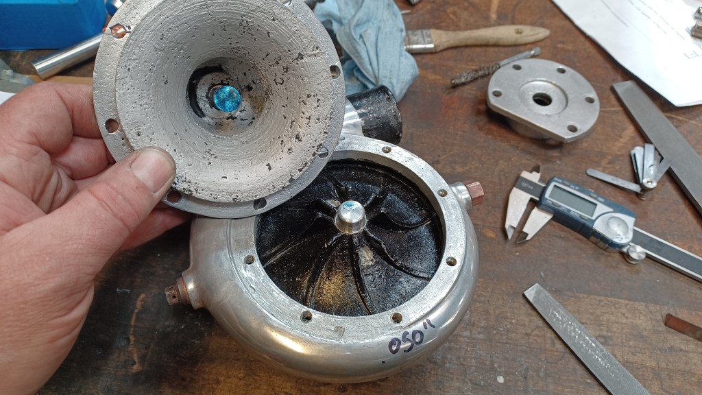 These repairs were not the ideal solution, but were enough to get the car through its debut event. A better repair would have included a new cover casting with a new end float button, new impeller casting and new shaft, but that was not possible in the time available.