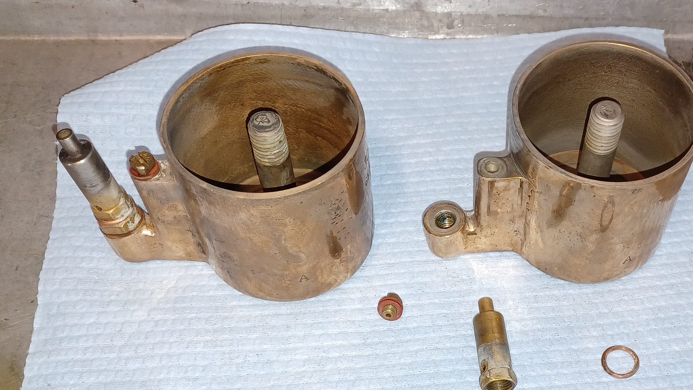 I had to carefully file off some of the excess solder from old repairs to drop some weight, as you can only space the float valves so far down before you run out of threads. I eventually got both floats happy and the fuel reliably shutting off where I wanted it.