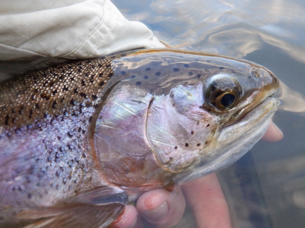 Like so many of the fish in these heavily pressured rivers, he’s been caught many times. His jaw is missing a chunk, and just below his eye is brown chocolate foam post emerger, maybe a size 22…