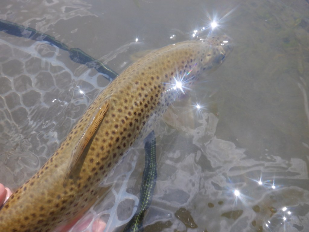 The breeze was favorable and pushing me back towards camp. There were small groups of fish rising on the way. At one point I made a bad cast that landed in a splash right next to a fish, and the fly was sunk, I could not see it. I stripped the line in to try again and the darn fish ate my fly as I was stripping it back. It was a pretty good brown, and I took a few pics without taking it out of the water. I watched it swim away and felt satisfied.