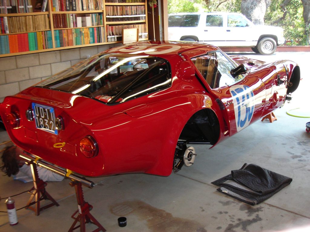 The Alfa Romeo TZ2 restoration was finished on this day, a few days after my 40th birthday. This team portrait includes, from left to right, Tom Smith, Ivan Zaremba, me, Chuck Mathewson and Rolly Boorman. Others worked to complete this project too; I think Phil Reilly & Co had around 12 or 13 employees at the time. Not to mention the other firms that did body and paint (Frank Zucchi, Scoggins Fiberglass) the motor (Norman Racing Group) and upholstery (Franzini Bros).